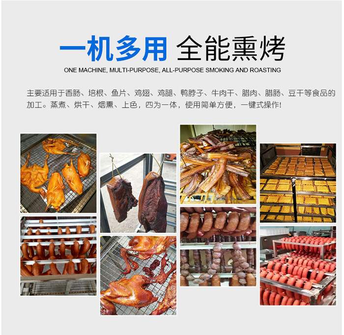 烟熏炉是烟熏、熟化过程中必不可少的设备,具有蒸煮、干燥、烘烤、烟熏、排风、清洗等功能。经过十几年的研制生产,根据客户的要求及市场反馈信息,对产品进行了更合理的改进,使其加热速度、烟熏效果都达到理想的效果。主要适用于香肠、培根、鱼片、鸡腿、鸡翅、鸭脖子、牛肉干、腊肉、腊肠豆干等食品的加工,使用简单方便,一键式操作。
